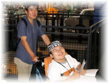 当日集まった学級生は12人ほど。普段養護学校に通う生徒さんや、今は卒業し施設に通っている方々だ。一口に心身障害といってもみんな違う。とってもよくしゃべる子、言葉ではうまく意思表示できない子、車椅子の上でうれしそうに体を揺する子、ずーっと寝たままの子。その1人1人に施設の職員、ボランティアの方が1〜2人ずつ付き添い、あるときは一緒にはしゃぎ、あるときはそっと見守りながら、それぞれが楽しめるように心を配っていた。